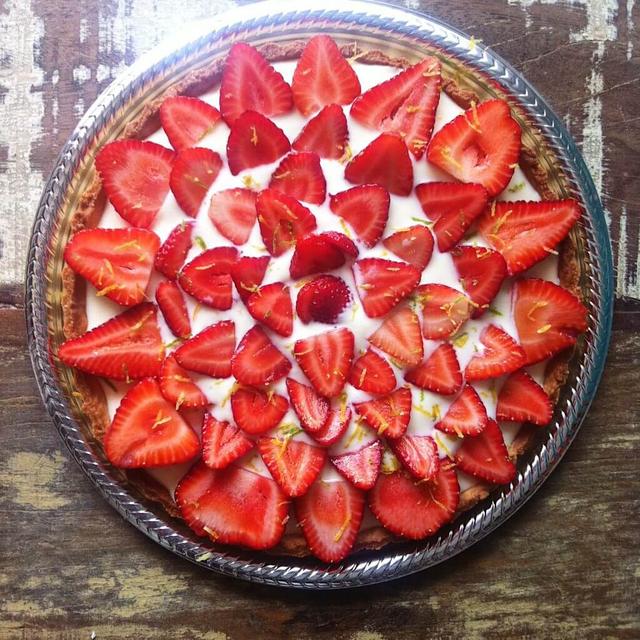 - Recheie a massa já fria com o recheio de limão e decore com os morangos fazendo círculos e polvilhe as raspas de limão para decorar.