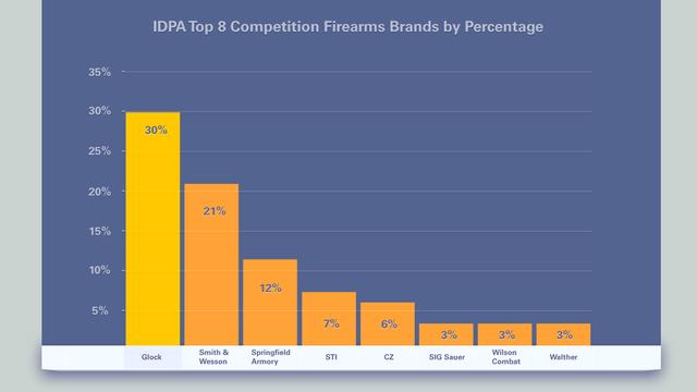 Chart 1 shows the top eight handgun brand breakdown. All Glocks and Walthers are polymer-framed striker fired guns, while S&W, SIG, and Springfield Armory offer both polymer and traditional steel guns.