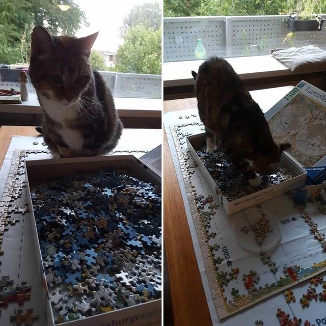 This cat thinks that this box of puzzle pieces is her new litter box. She walks around in it, sniffs, and has tried to pee in it several times. When her humans sit down to do a puzzle, she waltzes over and tries to pop a squat in the box.