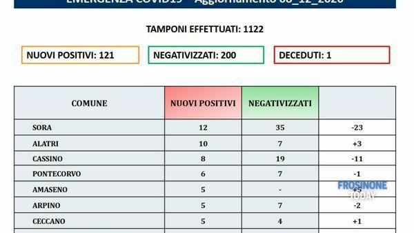 In provincia di Frosinone, stando al bollettino Covid diramato dalla Asl oggi martedì 8 dicembre, si registra 1 decesso, si registrano 121 nuovi positivi (oltre il doppio di quelli di ieri), ma con ben 200 negativizzati a fronte di ben 1122 tamponi effettuati rispetto ai 351 di ieri. Per quanto riguarda la persona morta, si tratta di un uomo di 58 anni residente a Alatri