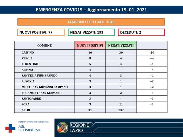 In provincia di Frosinone, stando al bollettino diramato dalla Asl oggi martedì 19 gennaio 2021, si registrano 2 decessi, 77 nuovi casi e 193 negativizzati a fronte di 1.046 tamponi effettuati. Le vittime sono una 81enne di Acquafondata e un 85enne di Sant'Andrea del Garigliano.