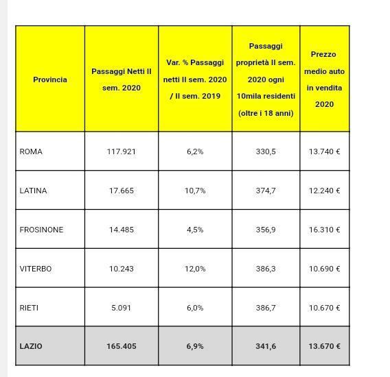 La classifica delle province per numero di passaggi di proprietà vede in testa Roma con 117.921 atti (+6,2%), seguita da Latina con 17.665 (+10,7%), Frosinone con 14.485 (+4,5%), Viterbo con 10.243 (+12,0%), e Rieti con 5.091 (+6,0%). Rispetto alla popolazione residente maggiorenne la situazione si trasforma: prima Rieti con 386,7 passaggi ogni 10mila abitanti, seguita da Viterbo (386,3), Latina (374,7), Frosinone (356,9) e, fanalino di coda, Roma (330,5).