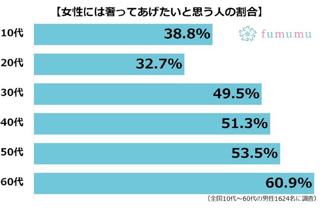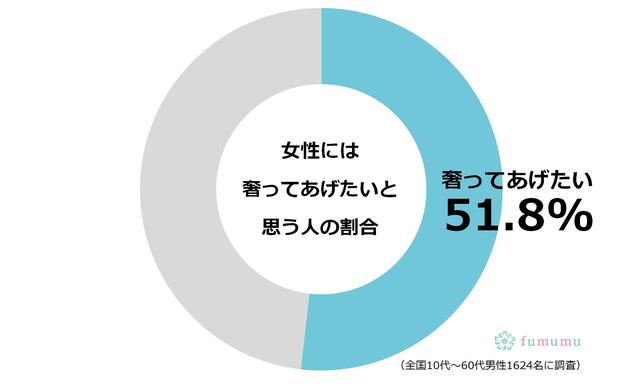 fumumu編集部が、全国10~60代の男性1,624名を対象に調査してみました。すると…全体の51.8%が「女性には奢ってあげたい」と回答しました。