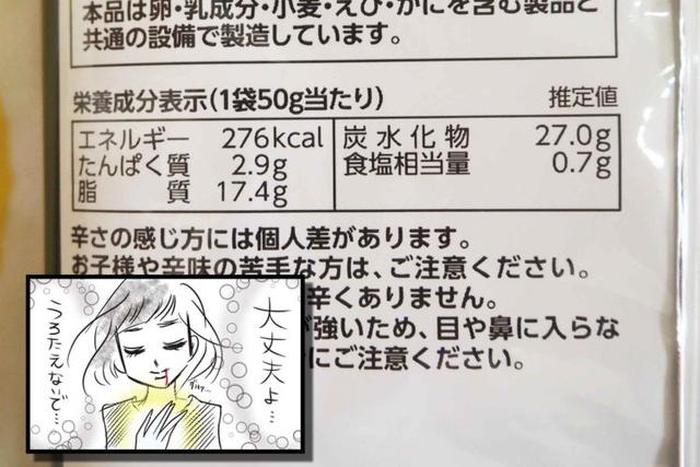 1袋50gあたりカロリーは276kcal、炭水化物は27.0g。まぁ辛いので食べれば食べるほど汗をかいてプラマイゼロの可能性があるので問題ありません!