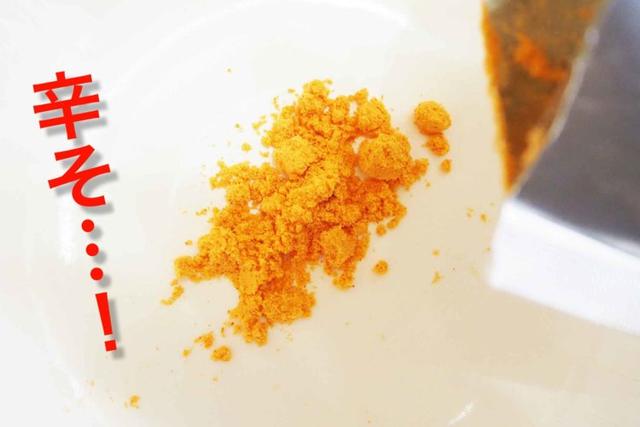 この時点では味わいも濃すぎず、とても安心して食べられるお味です。しかし、それではメーカーさんのコンセプトに反してしまう! いよいよ激辛パウダー投入にすすみます。