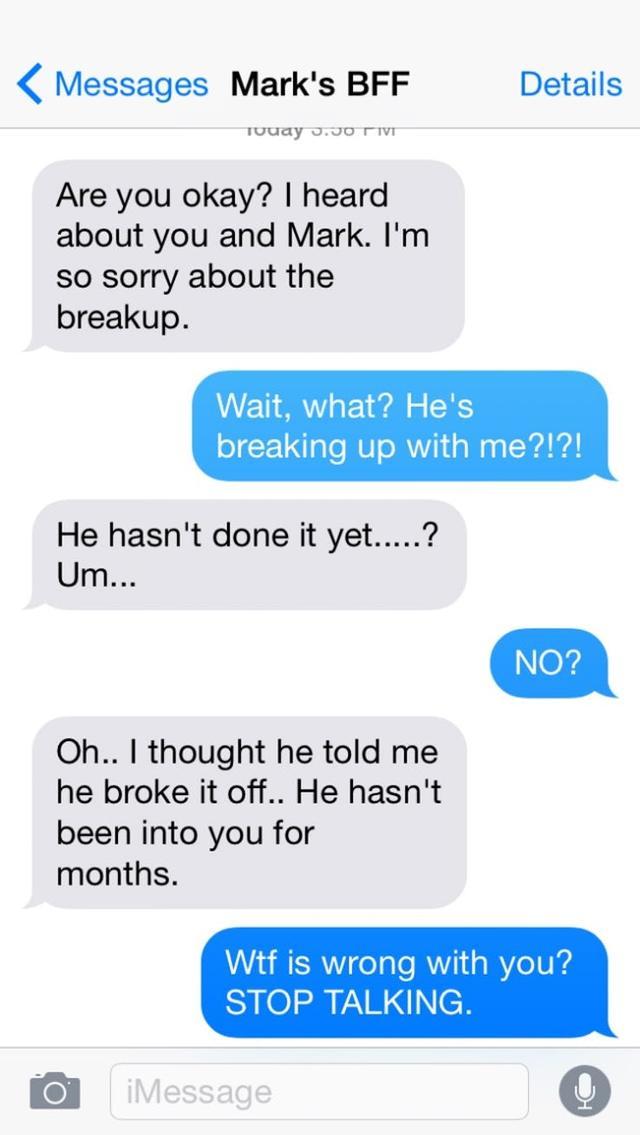 This goes on the list as one of the worst break up texts ever because it looks like Mark has been keeping the secret from his girl for a while. Here comes Mark’s best friend to the rescue, accidentally dropping the bomb so he doesn’t have to. That’s what good friends are for, aren’t they?