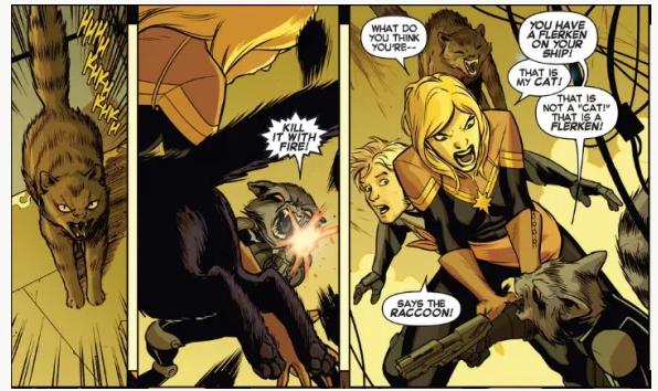 Pense nele em algo semelhante ao Rocket Raccoon de Guardiões da Galáxia, que é parecido com o nosso guaxinim. Na verdade, nas HQs a Capitã Marvel cruzou o caminho dos Guardiões, quando Rocket reconheceu o gato como um flerken e tentou matá-lo (imagem abaixo) antes que pudesse “botar seus ovos” – algo que realmente acabou acontecendo mais adiante.