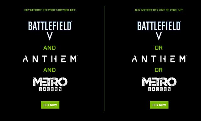 No presente momento, quem comprar qualquer placa da família RTX 20xx poderá resgatar Metro Exodus. Se a sua compra for uma RTX 2080 ou 2080TI, poderá receber, simultaneamente, Anthem e Battlefield V. Já quem comprar uma RTX 2070 ou 2060, poderá resgatar Anthem ou Battlefield V.