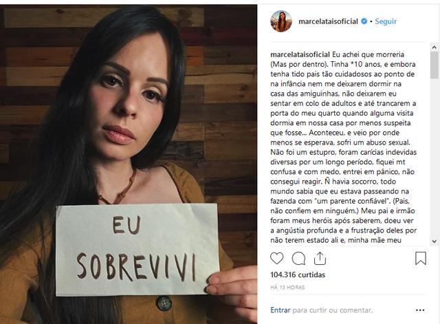 Muitos seguidores comentaram na publicação da Marcela, e deixaram suas mensagens de apoio e de solidariedade para com a cantora. Muitos fãs se identificaram com o texto, uma das seguidoras falou: –Não tenho coragem de escrever minha história a público assim, mas te digo que passei por algo parecido talvez igual, não lembro por quanto tempo mas acho que eu era bem pequena quando começou e foi revelado( tenho 16 hj) a pouco tempo, esse processo tem sido difícil demais mas uma frase que tem me ajudado , ” então menina não vá desanimar, você é linda e tem companhia, você vc é forte, só não sabia” e ainda não sei, obrigada @marcelataisoficial por nos ajudar por mais simples que seja o gesto.
