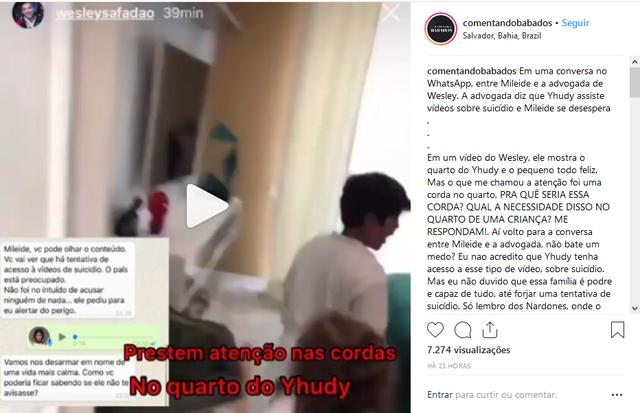 Nas redes sociais, no entanto, internautas divulgaram uma suposta conversa entre uma mulher, que seria a advogada de Safadão, e Mileide Mihaile, mãe de Yudhy, no WhatsApp. Nesta suposta conversa, a mulher diz a Mileide que a criança assiste a vídeos sobre suicídio.