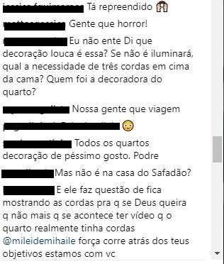 “Que decoração louca é essa? Se não é luminária, qual a necessidade de três cordas em cima da cama? Quem foi a decoradora do quarto?”, perguntou uma internauta. Outra afirmou: “Essas cordas são perigosas para um quarto de uma criança”. “Gente, alguém toma uma atitude, pelo amor de Deus”, falou um terceiro.