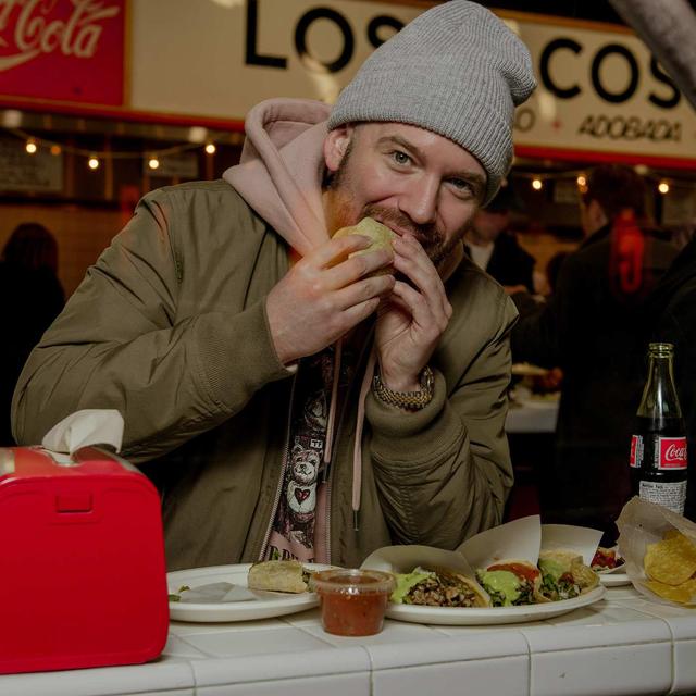 Sean Evans taking on Los Tacos No. 1. Photo: Scott Heins