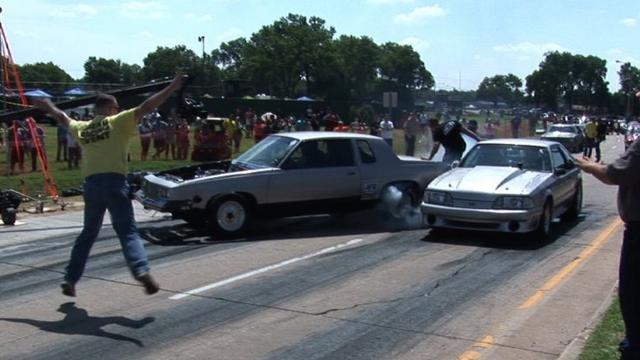 Crazy burnout from the ‘Small Town Weekend’ Street Drags in El Reno Oklahoma. Luckily the crew guy went into Jackie Chan mode and peddled his way out before the gate closed on him.
