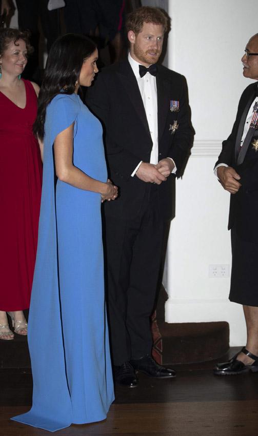 Si a su llegada a Fiji acertó con un simbólico y correcto conjunto en blanco impecable que recordaba inevitablemente a su cuñada Kate Middleton, unas horas después Meghan ha decidido abrazar su pasado como actriz para deslumbrar con su primer look de gala premamá con el que, de paso, ha rendido homenaje al país anfitrión. La duquesa de Sussex se ha enfundado en un impactante vestido largo azul de cuello caja, manga tulipán y cuerpo ceñido que marcaba su barriguita coronado con una teatral capa que partía de los hombros y se dividía en la cola. Este modelo, que no ha tardado en colapsar las redes sociales, pertenece a la firma británica Safiyaa, una casa que ha conquistado anteriormente a personajes como Kate Winslet, Jennifer Lopez o Eva Longoria, y está disponible en su web por 1.241 euros.