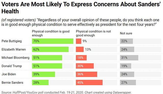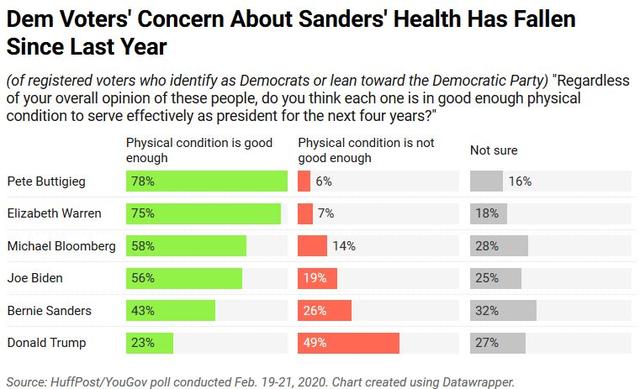 In this regard, the current Democratic front-runner still trails his rivals. Former Vice President Joe Biden, former New York City Mayor Mike Bloomberg, Massachusetts Sen. Elizabeth Warren and former South Bend, Indiana, Mayor Pete Buttigieg are all seen as physically capable of serving by a majority of Democratic and Democratic-leaning voters. But Sanders himself no longer faces negative ratings on the metric.