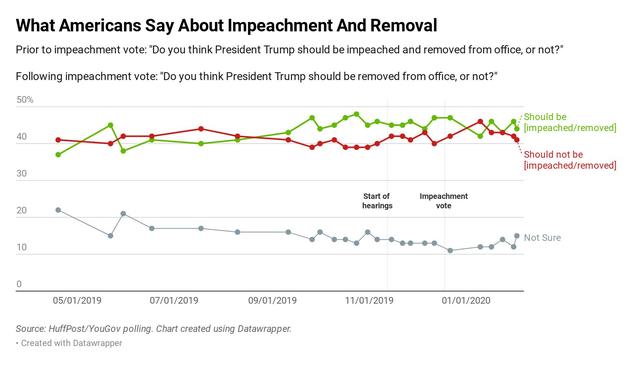 Americans remain roughly divided on whether Trump should be ousted. In the latest poll, 44% say that Trump should be removed from office, and 41% that he should not be. Two earlier polls, conducted Jan. 22-24 and Jan. 29-31, found backing for Trump’s removal at 43% and 46%, respectively ― variation that’s within the range of previous HuffPost/YouGov polling. In FiveThirtyEight’s aggregate, support for removing Trump stands at about 48%.
