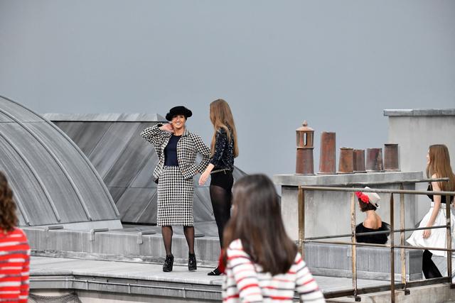 The woman, clad in a black and white tweed jacket with a matching skirt that looked like Chanel, hopped onto the runway during the fashion house’s finale.