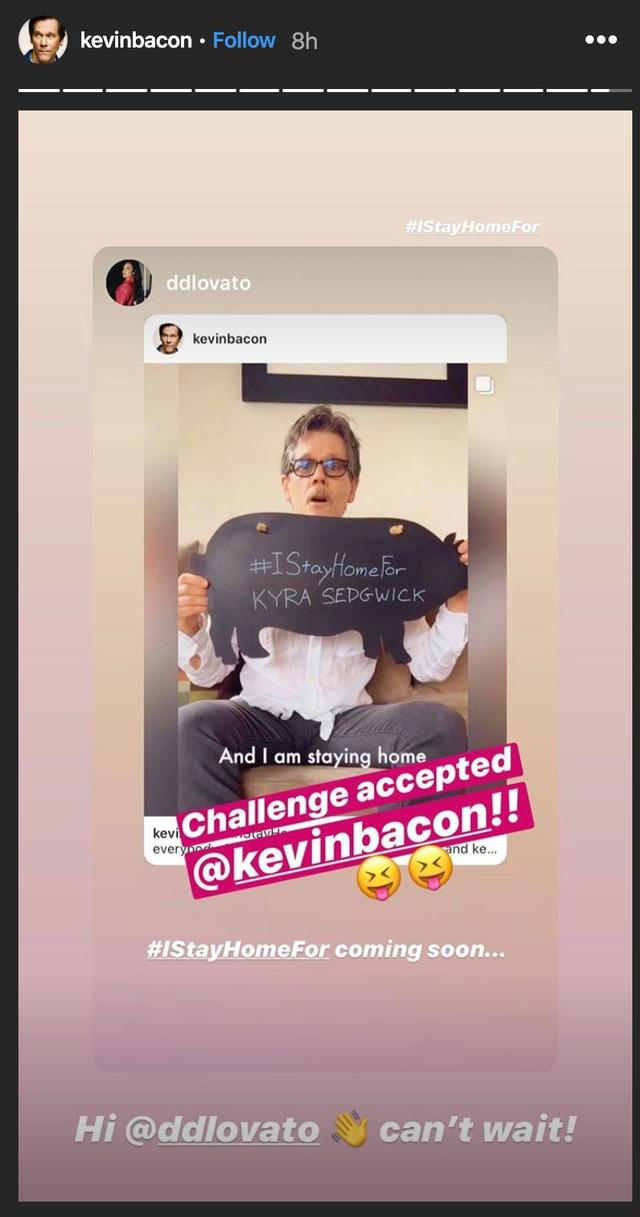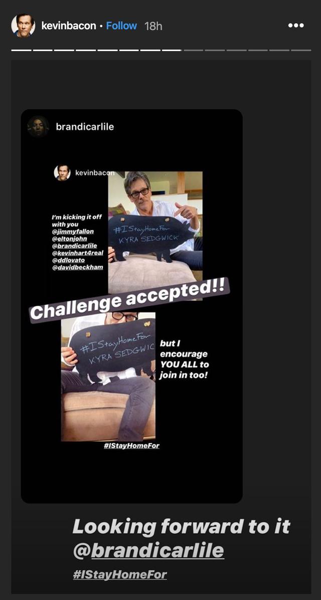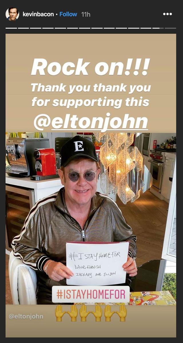 In his post, Bacon challenges Jimmy Fallon, Elton John, Demi Lovato, David Beckham, Brandi Carlile and Kevin Hart to share the name of the person they’re staying home for.