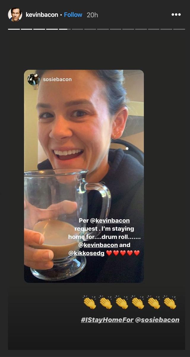 In his video and caption, he implores fans to “post a video or photo with a sign like mine, telling who you are staying home for and ask 6 friends to do the same.” His sign reads, “#IStayHomeFor Kyra Sedgwick,” his wife of nearly 32 years.