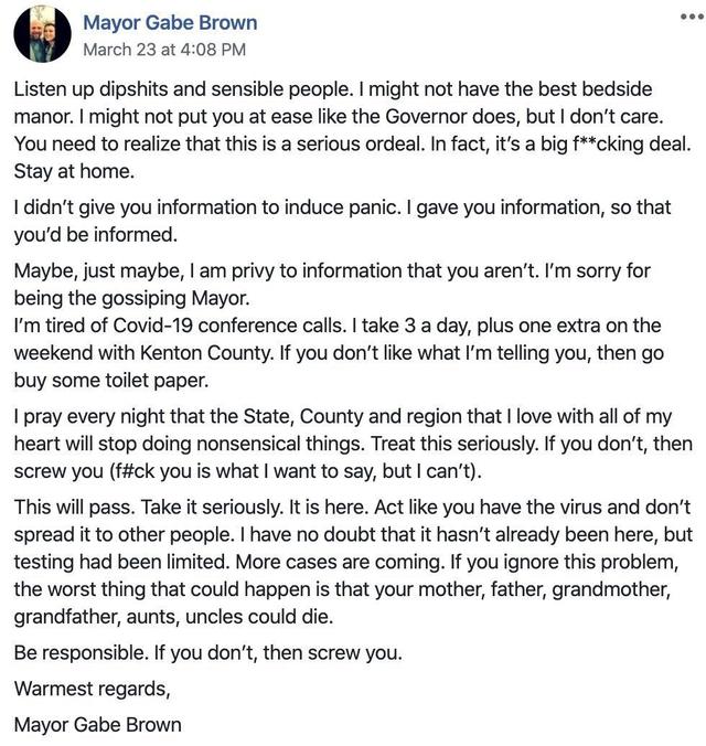 “Listen up dipshits and sensible people,” wrote Mayor Gabe Brown of Walton, Kentucky. “I might not put you at ease like the Governor does, but I don’t care. You need to realize that this is a serious ordeal. In fact, it’s a big f**cking deal. Stay at home.”
