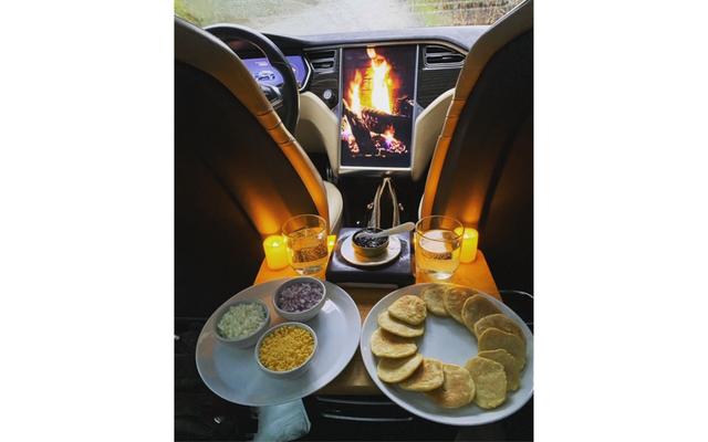 We returned home on Feb. 16 from a trip to New York and were required to self-quarantine for 14 days because of the virus. I had been very stressed out because the trip was so strange due to the pandemic. My husband knew this and wanted to do something to delight me for date night away from our three teenagers. He made Bellinis and creme fraiche in his home office on a day full of Zoom meetings (somehow he managed this without my suspecting anything), ordered caviar online, and packed a feast into the trunk of our Tesla. He then took me for a “drive” and set up the car with LED candles, placed a cutting board over the console for a table, poured champagne and served me dinner with the Fireplace app on for ambience. It made me feel special and took the world away, right when I needed it most!