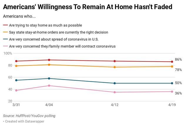 In the most recent HuffPost/YouGov survey, conducted last Friday through Sunday, 86% of Americans said they were trying to stay home as much as possible, and about 65% said they’d continue to stay home even if all restrictions were lifted in their area.
