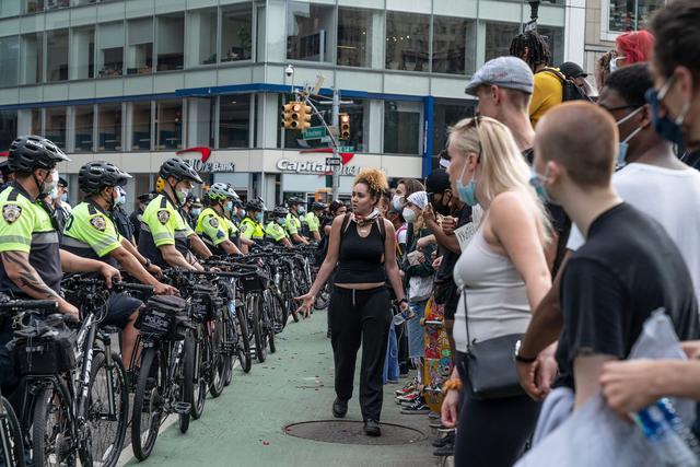 Minneapolis police officers wore body armor and carried riot gear to face off with visibly unarmed protesters who were wearing T-shirts and carrying signs. After some in the crowd began to break windows and spray graffiti, officers fired tear gas and foam pellets. Nearby buildings and businesses were set on fire during the protests.