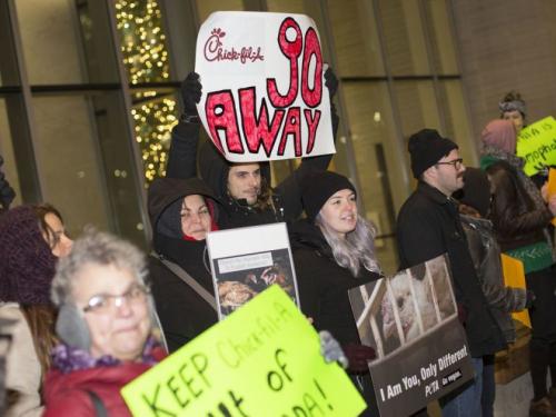 They carried signs saying “Chick-fil-A hates LGBTQ+ people,” and “Chick-fil-A is a homophobe.”