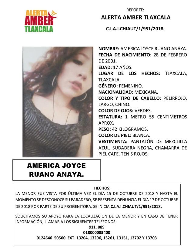 Mientras que América Joyce Ruano Anaya desapareció el 15 de octubre en Tlaxcala, Tlaxcala y hasta el momento no hay noticias de su paradero.