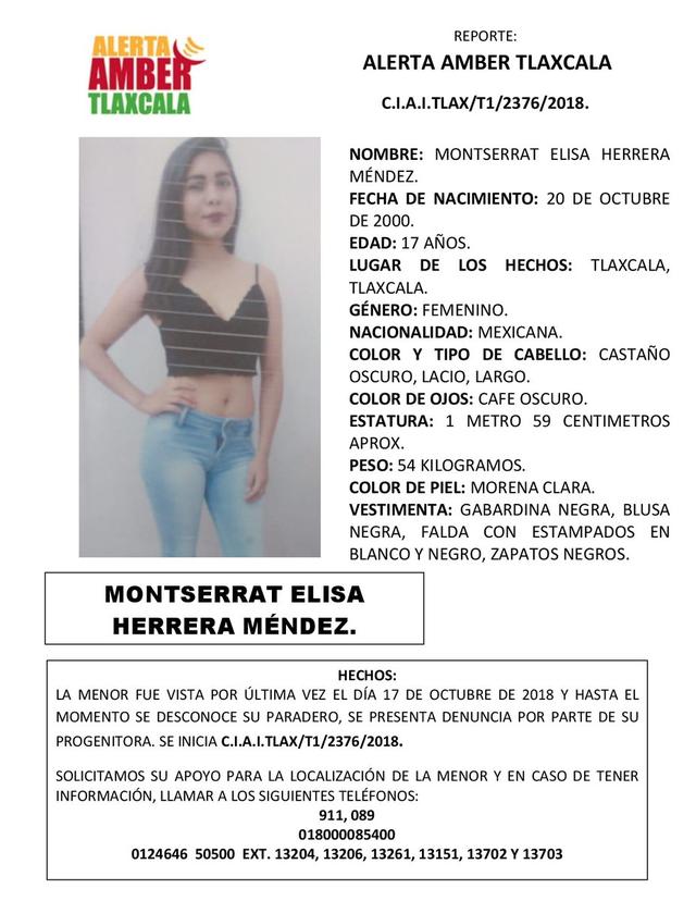 Montserrat Elisa Herrera Méndez desapareció en Tlaxcala, Tlaxcala el pasado 17 de octubre y hasta el momento se desconoce su paradero.