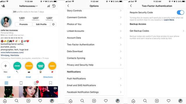Go to your profile and tap on the Settings icon. It looks like a gear on iPhone and three vertical dots on Android phones. Scroll down and tap Two-Factor Authentication.Tap Require Security Code to turn it on.