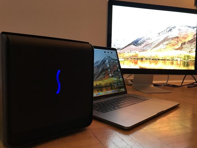 I do plan on running native macOS games directly from the Mac mini so I got Apple's own eGPU enclosure, $599. It comes with a mid-range AMD RX 580 GPU which is a good match for the Coffee Lake CPU's in our Mac mini. You plug it in to the TB 3 port on the back of the Mac mini, and Mojave just makes it work.