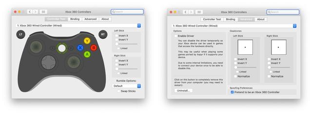 Download and install the open source 360Controller driver to be able to run your non-macOS native gamepads like the Xbox 360 or Xbox One controller. This will install a new System Preference panel that allows you to configure your gamepads. I strongly suggest to checkmark the Spoofing Preferences option to Pretend to be an Xbox 360 Controller under the Advanced tab if you don't actually have a true Xbox controller for compatibility purposes.