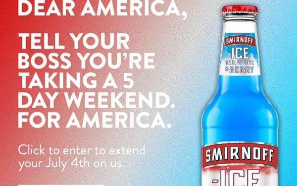 Claiming that the mid-week timing of this year's July 4 vacation is bound to place something of a damper on the parties, Smirnoff Ice's Red, White & Berry range is running a drawing in which 100 U.S. participants will certainly receive loan to cover taking off two even more days.