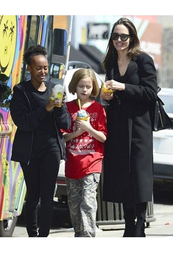 Photographers were able to catch the famous actress during her walk through Los Angeles with her daughters Vivienne and Zahara. In the photo, Jolie is captured in a laconic black long coat, suede boots and with a large bag over her shoulder.