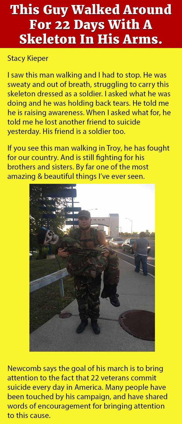Army veteran John Newcomb recently went on a 22-day march holding a skeleton dressed in Army fatigues. Some who came across the marching veteran may have assumed it was a Halloween costume, but the reality is a lot scarier — and sadly, very true.