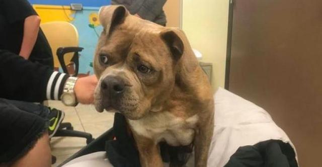 Quando o vira-lata chegou ao hospital, os veterinários perceberam que sua cabeça estava inclinada para o lado. Os médicos não sabiam se a condição do cachorro de três anos era causada por uma malformação genética ou se ele estava trancado em uma gaiola que era pequena demais para garantir que ele não pudesse levantar a cabeça durante o crescimento. .