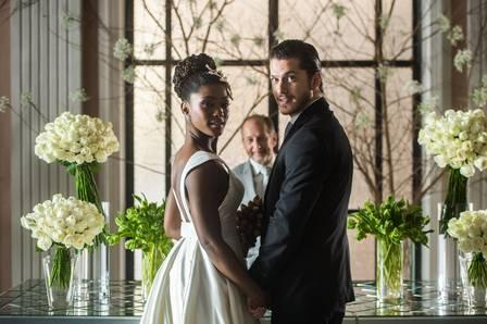 Depois de muitas idas e vidas, Raquel (Erika Januza) e Bruno (Caio Paduan), finalmente se casam em “O outro lado do paraíso”. O visual da noiva é deslumbrante: o vestido é da Pronovias, e na trama foi Nádia (Eliane Giardini) quem escolheu o modelo para a nora. O arranjo do cabelo é uma flor da Muggia para Martu, e os brincos de brilhantes são da Paixão Joias, uma joalheria de Belo Horizonte. O buquê usado é todo de capim dourado feito especialmente pelas artesãs do Quilombo do Mumbuca, em Mateiros, no Jalapão, para a novela.