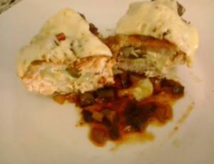 2Coloque dentro uma das fatias de queijo, tiras de tomate, pimentão e cebola;