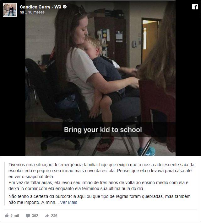 A mãe continua a sua história bastante surpreendente: "Em vez de tirar vantagem deste contratempo para perder o resto do dia na escola, a minha filha levou o seu irmão de 3 anos à sua escola e deixou-o a dormir uma sesta sobre ela enquanto terminava o seu dia normal como estudante, eu não tenho certeza se era permitido ou se ela infringiu os regulamentos ao fazer isso, mas eu não me importo, a minha adolescente decidiu ajudar-nos.