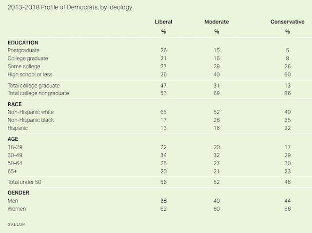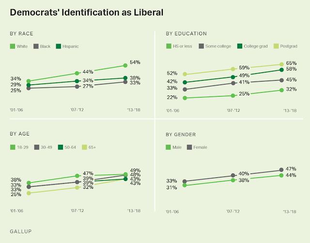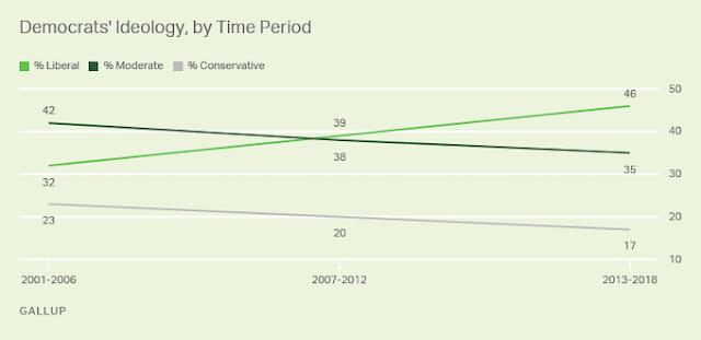 At the turn of this century, a plurality of Democrats identified as moderates (42%), while 32% said they were liberals, and 23% claimed to be conservatives. That has changed significantly. Now the largest group in the party are liberals (progressives) -- a plurality of 46%. Only 35% are moderates and 17% are conservatives. That's a 14 point growth for liberals, and a 7 point drop for moderates.