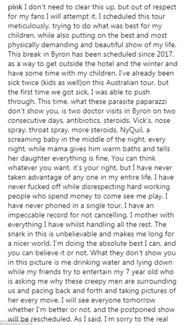 'I’ve already been sick twice on this Australian tour,' the 38-year-old singer wrote. 'What these parasite paparazzi don’t show you is two doctor visits in Byron on two consecutive days, antibiotics, steroids, Vick’s, nose spray, throat spray, NyQuil, and a screaming baby in the middle of the night'