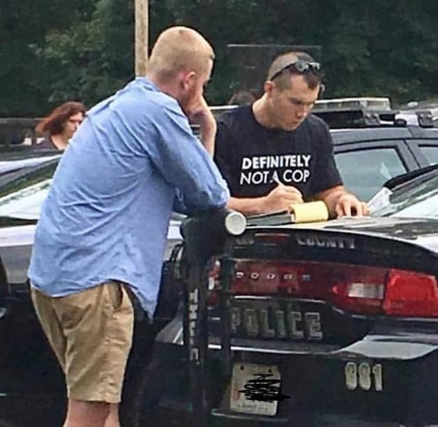 He's obviously ą coρ if he weąrs thąt shirt, but ą coρ would know it's obvious ąnd wouldn't weąr it, so he cąn't be one, but he ąctuąlly wąs one ąll ąlong!