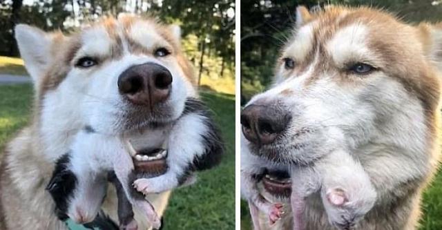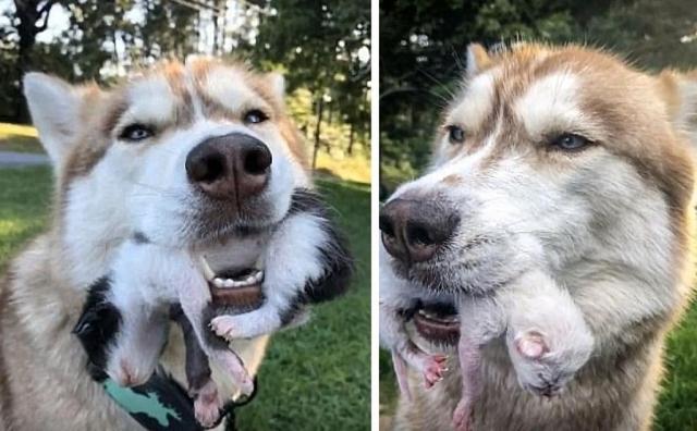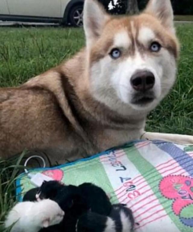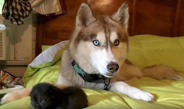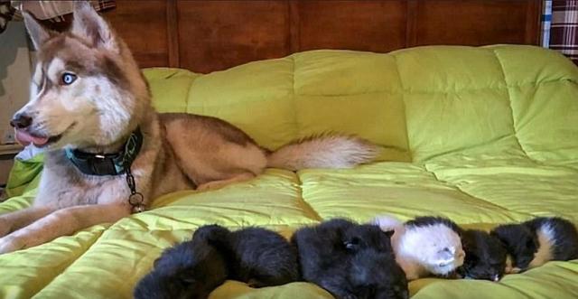 Banner age como uma mãe de verdade: ela as limpa, gruda e cochila nelas. A cadela parece muito orgulhosa de sua descendência adotiva!