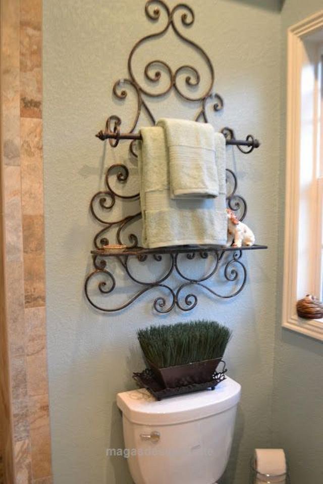 Some people may have more than one towels in their bathroom. If you do so, you have to decide the kind of storage place to save the towel. A metal storage place which has artistic shape can be a nice idea to keep your towels. You can patch it at the wall over the toilet.