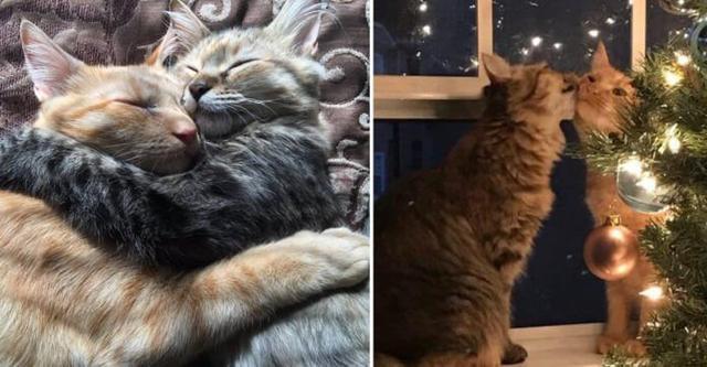 Louie and Luna were rescued separately but found each other at the shelter. They became inseparable! As you can see, they are in love! Louie and Luna met at STAR Rescue in Gainesville, FL – it was love at first sight. They clung to each other and wouldn’t let go. Their human dad, James, said Luna is an orange tabby and Louie is an orange and brown Maine Coon.