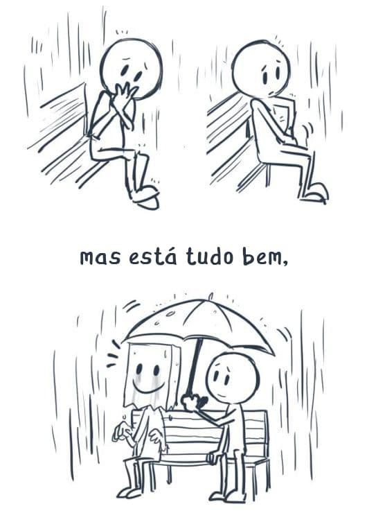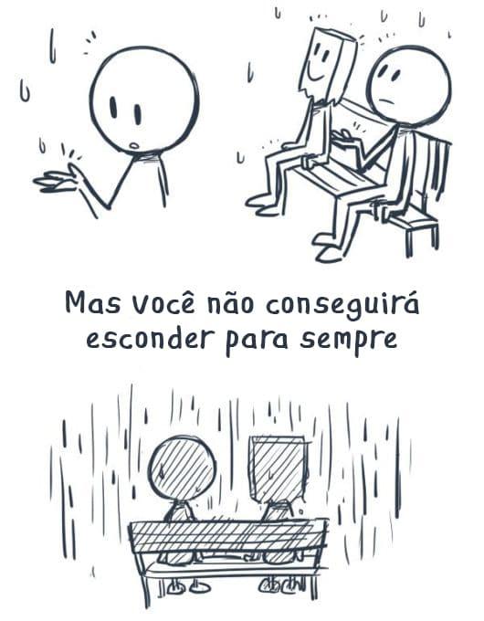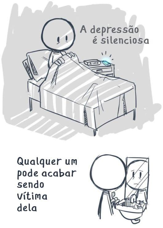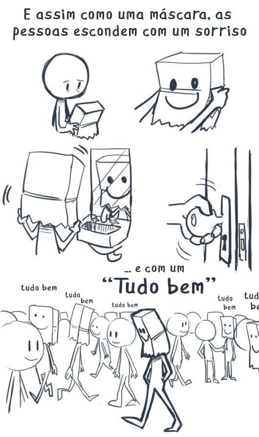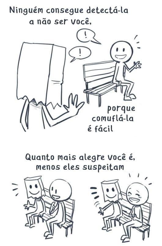 Foi pensando nisso que trazemos aqui uma tirinha famosa da internet onde a artista Colleen Butters publicou no Tumblr há alguns anos. Nas tiras, ela aborda justamente o problema da depressão. De como pessoas depressivas agem como se nada estivesse acontecendo na frente de outras pessoas até como podem ser sutis o início da condição.