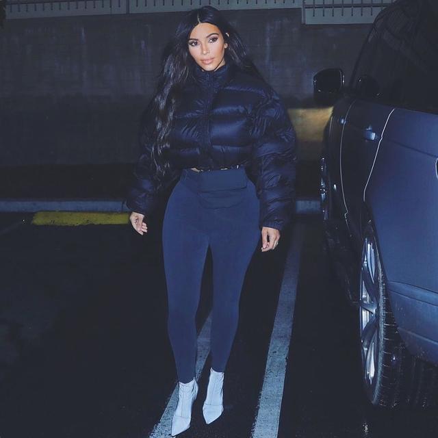 Kim styles her fave puffer jacket with tights, white booties and a fanny pack.