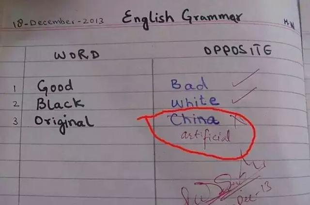 Yes this student is brilliant. I have never such a sharp mind. How cleverly he told the opposite of original. He knows china is know for what kind of goods. Hats off.