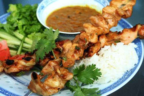 To prepare the sauce, combine garlic, peanut butter, soy sauce, lime juice, ginger and red pepper flakes in a blender and blend until smooth. Set aside. Thread chicken onto skewers. Brush with olive oil and sprinkle with salt and pepper. Cook on a pre-heated grill over medium high heat for 2 to 3 minutes per side or until cooked through. Serve topped with peanut sauce or on the side.